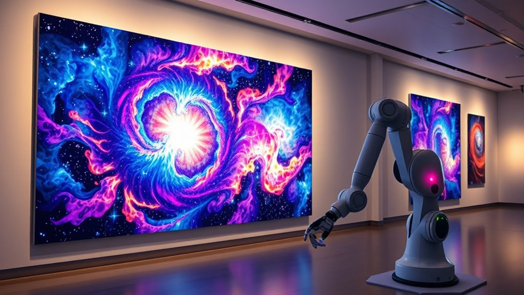 Have you ever wondered how computers can create stunning, original artwork? It’s a fascinating intersection of technology and creativity that challenges our traditional notions of art. As AI algorithms generate images, paintings, and sculptures, questions about ethical implications and artistic authenticity come to the forefront. You might find yourself asking whether these pieces can truly be considered art or if they’re just clever simulations. The debate hinges on whether AI can possess the soul or emotional depth that humans bring to their work, or if it’s simply a product of complex programming. Critics worry that relying on machines for creative output could undermine the value of human artistry, raising concerns about originality and the true meaning of creativity. When an AI produces a piece, it’s often trained on vast datasets of existing artworks, which prompts questions about ethical implications—specifically, the ethics of using other artists’ work to teach machines without their consent or compensation. Some argue this diminishes the artistic authenticity of AI-created art, as it lacks the intentionality and personal expression that define human artistry. Yet, others see AI as a tool that can expand creative possibilities, enabling artists to explore new aesthetics and push boundaries they might not reach alone. For many, the question isn’t just whether AI can produce beautiful images but whether those images hold genuine artistic value. The concern about authenticity isn’t just philosophical; it affects how society perceives and values art. If a computer can generate art that’s visually stunning, does that diminish the effort and skill traditionally involved? Or does it open up a new domain of creative collaboration? Ethical considerations also extend to issues like color accuracy, as precise color reproduction can significantly impact the visual quality and realism of AI-generated images. These questions make it clear that AI-generated art isn’t just about algorithms; it’s about redefining what we consider genuine art and who gets to be an artist. As you observe these developments, it’s important to recognize that AI challenges us to reconsider long-held beliefs about creativity, authenticity, and ethics in art. Whether you see this technology as a threat or an exciting frontier, it’s undeniable that AI is reshaping the creative landscape, prompting us to rethink what it truly means to create.
