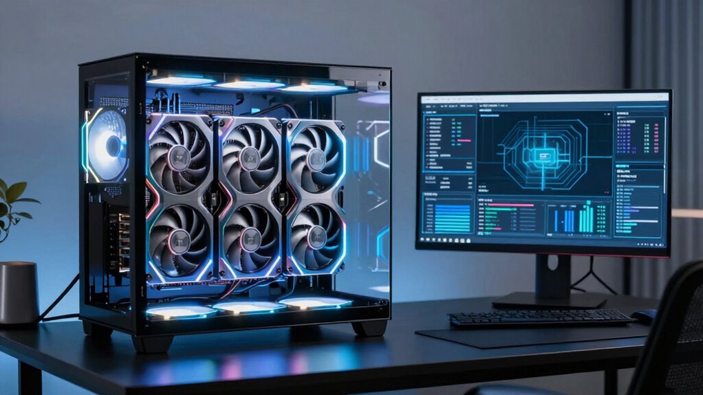 Ever wondered how to keep a high-performance AI desktop cool? I recommend liquid cooling systems for their superior heat dissipation and quieter operation. Custom loops with high-quality radiators and pumps are excellent choices, especially when paired with efficient airflow cases. These solutions prevent thermal throttling, ensuring your GPU and CPU perform at their best. Trust me, investing in good cooling extends your system’s lifespan and boosts AI training efficiency considerably.