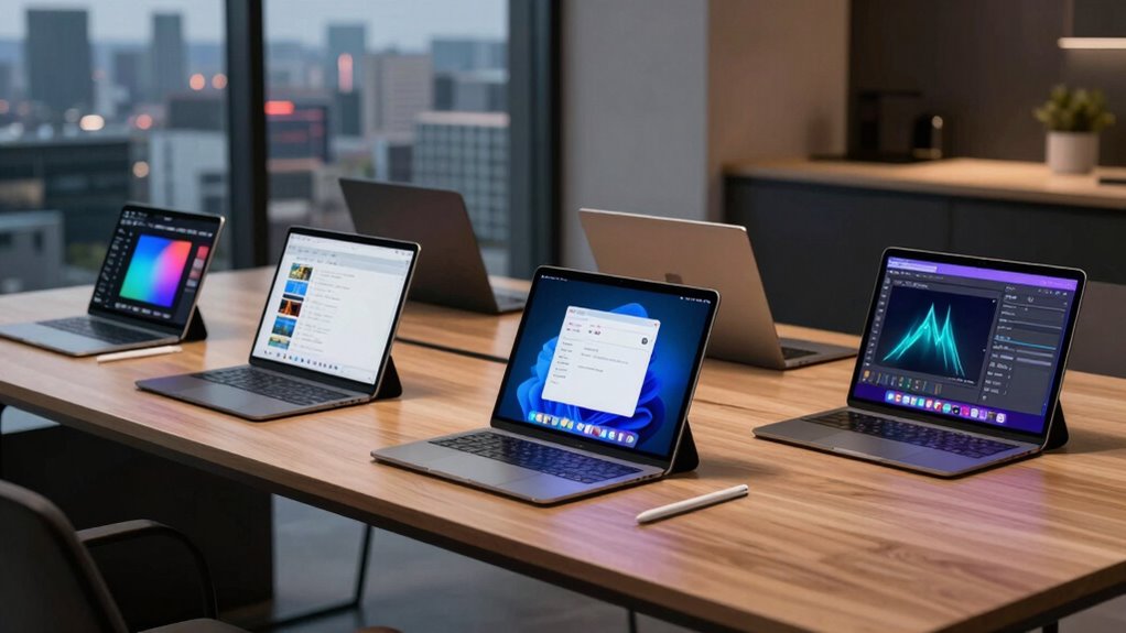 Choosing an iPad alternative for professionals hinges heavily on performance capabilities, as these determine how well the device handles demanding tasks. I look at the processing power, guaranteeing the CPU and GPU can keep up with intensive work like video editing, 3D modeling, or complex multitasking. Adequate RAM is essential—more RAM means smoother multitasking and better performance with resource-heavy applications. Support for high-performance styluses and external peripherals is also key, especially for creative workflows. Additionally, I check compatibility with essential professional software to avoid functionality issues. Overall, solid hardware specs, including fast connectivity options and reliable build quality, make a significant difference in day-to-day productivity. These performance features guarantee the device can meet the rigorous demands of professional work without lag or frustration.