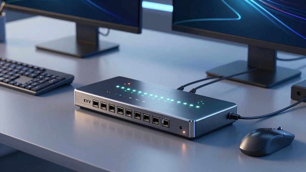 Choosing the right KVM switch is like finding the perfect conductor for your digital orchestra—each piece needs to work harmoniously. I once struggled with cluttered cables until I found a sleek, dual-monitor KVM switch; it transformed my workspace into a symphony of efficiency. Remember, the right switch simplifies your setup, boosts productivity, and keeps everything running smoothly. Trust me, a good KVM switch is the silent maestro your desk needs.