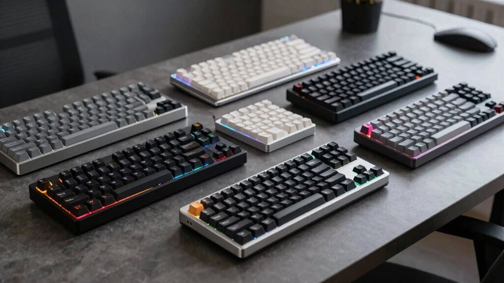 Selecting the right switch type for a low-profile mechanical keyboard is essential because it directly affects your typing experience. Low-profile switches generally have shorter travel distances, offering faster response times, which is great for gaming and quick typing. Tactile switches provide noticeable feedback, making them ideal for accuracy and precision, while linear switches deliver smooth, quiet keystrokes suited for gaming or quieter environments. The actuation force varies, with some switches requiring as little as 40g, reducing fatigue during long sessions. Noise levels also differ; tactile and clicky switches tend to be louder, whereas linear and semi-quiet options produce less sound. Your choice should align with your primary use—whether you prioritize speed, accuracy, noise, or comfort—to personalize your typing experience.