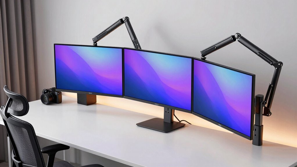 Monitor arms support different ultrawide monitor mounting patterns by offering adjustable VESA compatibility or adaptable clamps. I look for arms with versatile mounting options, such as multiple VESA hole patterns or clamp designs that fit various monitor sizes. This way, I can securely attach my ultrawide monitor regardless of its mount pattern. The flexibility guarantees I get a stable, ergonomic setup tailored to my workspace, no matter the monitor’s mounting specifications.