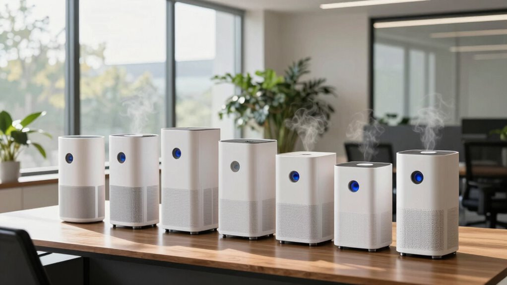 In 2026, I recommend seven top office air purifiers that effectively tackle allergies. These include models like GermGuardian, Westhey, Levoit, and Blueair, each offering strong HEPA filtration, smart features, and quiet operation suitable for different room sizes. Whether you need coverage for large spaces or compact design for desks, these units excel at removing allergens, pet dander, and odors. Keep exploring to find out which one suits your workspace best.