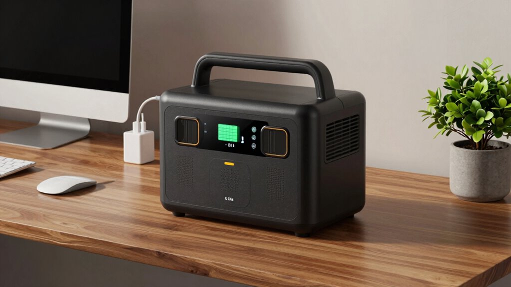 Have you considered the various recharging methods available for a portable power station? They can be recharged through AC outlets, solar panels, car chargers, or gas generators. Fast recharging options like AC or solar can typically restore about 80% of capacity in under two hours, which is ideal during emergencies or outdoor activities. Solar panel compatibility offers a renewable energy source, though full charges depend on sunlight, usually taking 2-4 hours. Some models support hybrid charging, combining AC and DC sources simultaneously, reducing overall recharge time and ensuring continuous power. The flexibility to choose different recharging methods means you can adapt to various situations, whether you’re at home, on the road, or off-grid. This versatility is essential for maintaining reliable backup power for your home office needs.