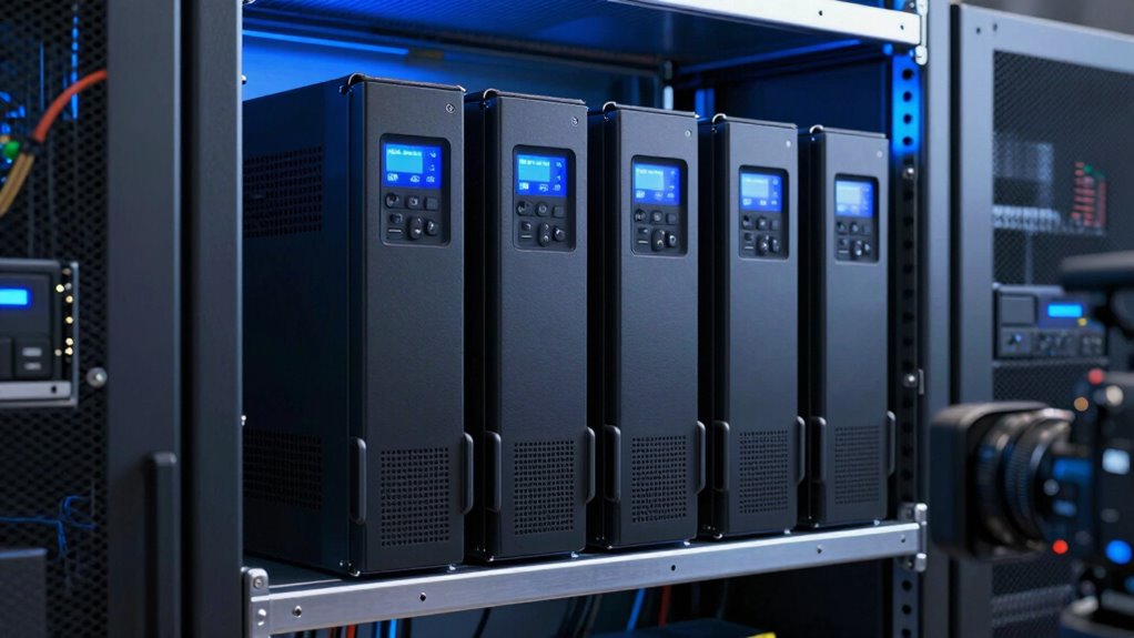 Rackmount UPS units directly impact network performance by providing clean, stable power, reducing outages and voltage fluctuations that can cause data loss or hardware damage. I’ve found that a dependable UPS guarantees my network stays up during power interruptions, maintaining smooth data flow. It also prevents unexpected shutdowns, which can corrupt files or hardware. Overall, a good rackmount UPS keeps my network efficient, secure, and resilient against power issues.