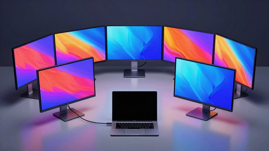 The maximum daisy-chain support for Thunderbolt monitors is typically six devices, including the host computer. I’ve found that this setup allows me to connect multiple monitors and peripherals seamlessly, reducing clutter and improving my workflow. Keep in mind, the actual number can vary depending on the specific Thunderbolt version and device capabilities. Always check the manufacturer’s specs to guarantee compatibility and peak performance for your setup.