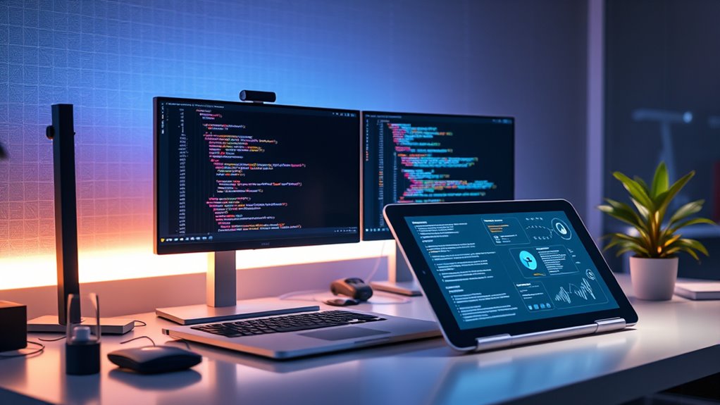 AI assistants help streamline repetitive tasks, suggest code snippets, and even troubleshoot bugs, saving you valuable time. Instead of manually searching for solutions or writing boilerplate code, you get intelligent suggestions that accelerate your progress. This boost in developer productivity allows you to focus more on complex problem-solving and creative aspects of your projects. With AI handling routine coding chores, you can iterate faster, deliver features sooner, and reduce burnout caused by monotonous work. Additionally, understanding the role of contrast ratio in projectors can help you create better visual environments for testing and development.