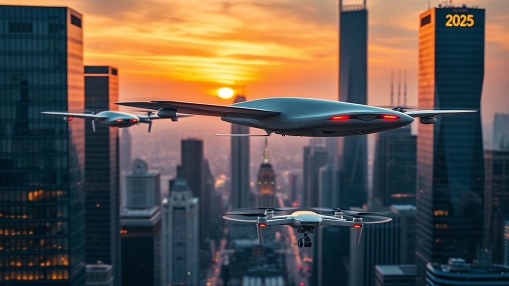 By 2025, your urban skies will be bustling with drone deliveries and air taxis, transforming how you move goods and commute. These aerial vehicles aim to make transportation faster and more efficient, but they also bring challenges like noise and regulation. Governments and companies are working to balance innovation with safety and comfort. If you’re curious about how these changes will impact daily life and what obstacles remain, there’s much more to explore ahead.